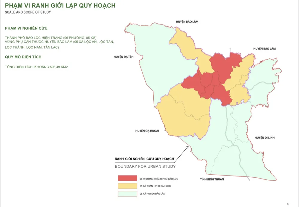 Theo đó, phạm vi ranh giới lập quy hoạch của TP Bảo Lộc hiện trạng gồm có 6 phường, 5 xã, vùng phụ cận thuộc huyện Bảo Lâm (xã Lộc An, Lộc Tân, Lộc Thành, Lộc Nam, Tân Lạc), với diện tích 598km2.