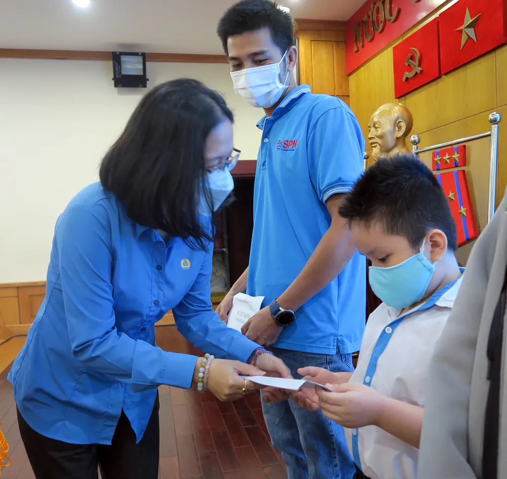 Công đoàn ngành giáo dục TPHCM tặng quà cho học sinh có hoàn cảnh khó khăn do dịch Covid-19. Ảnh: THU TÂM