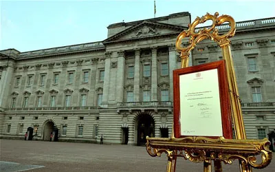 Thông báo về sự ra đời của Hoàng tử xứ Cambridge được đặt trang trọng trên một khung vàng trước Điện Buckingham