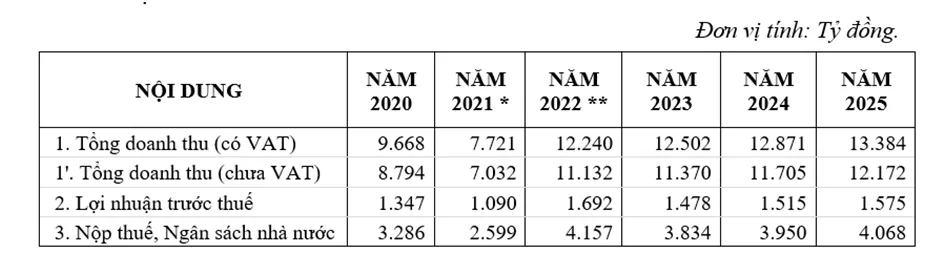 Kế hoạch sản xuất kinh doanh của Công ty TNHH MTV XSKT TPHCM giai đoạn 2020 - 2025 (*) Do phải tạm dừng hoạt động từ ngày 9-7-2021, đến ngày 23-10-2021 Công ty mới phát hành và quay số mở thưởng trở lại (tạm dừng phát hành 30 kỳ xổ) nên ảnh hưởng rất lớn đến doanh thu xổ số. (**) Các chỉ tiêu chủ yếu của năm 2022 được xây dựng trên cơ sở số kế hoạch nộp ngân sách mà Bộ Tài chính, Tổng Cục Thuế giao.