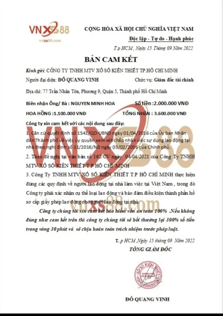 Để chiếm lòng tin của người dân, các đối tượng lừa đảo còn làm giả giấy xác nhận có chữ ký của lãnh đạo Công ty TNHH Một thành viên Xổ số kiến thiết Thành phố Hồ Chí Minh với cam kết sẽ hoàn lại 300% số tiền mà người dân đã đóng nếu không đảm bảo các nội dung được giới thiệu và văn bản (giả mạo) đã cung cấp. Sau khi đã mời gọi được người dân đăng ký qua app hoặc trang web, các đối tượng lừa đảo bắt đầu kêu gọi người dân tham gia nạp tiền, chuyển tiền với nhiều hình thức, như:
