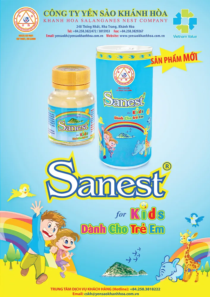 Tự hào là đơn vị trực tiếp khai thác sản xuất và chế biến các sản phẩm từ Yến sào đảo thiên nhiên Khánh Hòa, thực hiện chiến lược đa dạng hóa sản phẩm và hướng đến mục tiêu nâng cao sức khỏe cộng đồng, mang giá trị bổ dưỡng của Yến sào đảo thiên nhiên đến với khách hàng trong nước và quốc tế, Công ty Yến sào Khánh Hòa luôn chú trọng nghiên cứu các dòng sản phẩm mới chất lượng cao nhằm giúp người tiêu dùng có nhiều sự lựa chọn sản phẩm phù hợp với nhu cầu chăm sóc bảo vệ sức khỏe cho bản thân và gia đình. Tiếp nối thành công của các sản phẩm nước yến sào Sanest hiện đang có mặt trên thị trường, Công ty Yến sào Khánh Hòa đã nghiên cứu và phát triển dòng sản phẩm mới: NƯỚC YẾN SÀO KHÁNH HÒA SANEST DÀNH CHO TRẺ EM ĐÓNG LON. Đây là sản phẩm đã được các chuyên gia từ Công ty Yến sào Khánh Hòa dày công nghiên cứu và kết hợp những thành phần bổ dưỡng, phù hợp với sự phát triển từng ngày của con trẻ như Yến sào nguyên chất giúp tăng cường sức đề kháng cho cơ thể, kích thích tiêu hóa, tăng cường trí nhớ và bổ sung một số khoáng chất cần thiết cho cơ thể như canxi, sắt, kẽm; Taurine hỗ trợ cho sự tăng trưởng, phát triển thị giác, trí não; HMO (2’-FL) giúp tăng cường hệ miễn dịch, giúp hệ tiêu hóa khỏe mạnh. Tất cả những thành phần này đã được phân tích dựa trên kết quả thực nghiệm để có được liều lượng tối ưu mang đến hiệu quả tốt nhất dành cho trẻ.