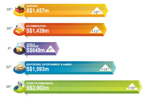 Theo phân tích của Tổng cục Du lịch Singapore, khách du lịch quốc tế đến Singapore, đã không tiếc tiền chi tiêu vào đa dạng loại hình dịch vụ. Trong đó, vui chơi, giải trí, tham quan chiếm đến 22%, với doanh thu gần 1.600 triệu SGD.