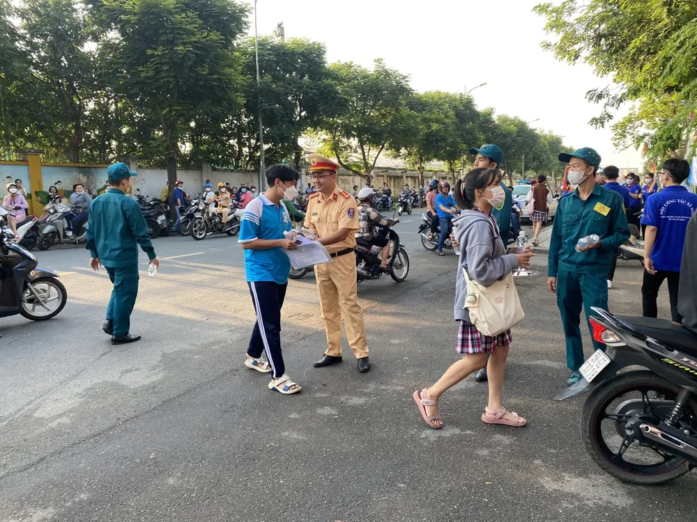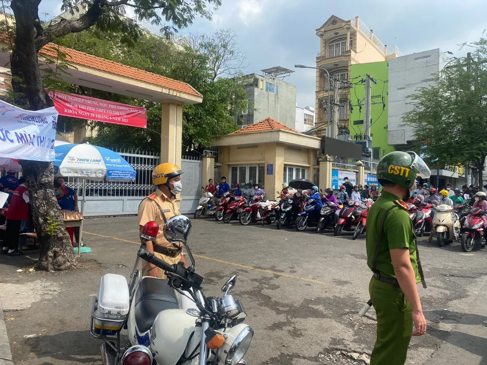 Tại điểm thi Trường THCS Colette (đường Hồ Xuân Hương, phường 6, quận 3) và Trường THPT Hùng Vương (phường 12, quận 5), lực lượng Công an TPHCM từ sáng sớm đã có mặt khá đông lực lượng chức năng để làm tốt công tác phân luồng giao thông; hướng dẫn thí sinh vào phòng thi, hướng dẫn phụ huynh sắp xếp xe ở vị trí chờ đón con, em… Ở nhiều điểm thi khác ở các quận huyện, TP Thủ Đức cũng tương tự.
