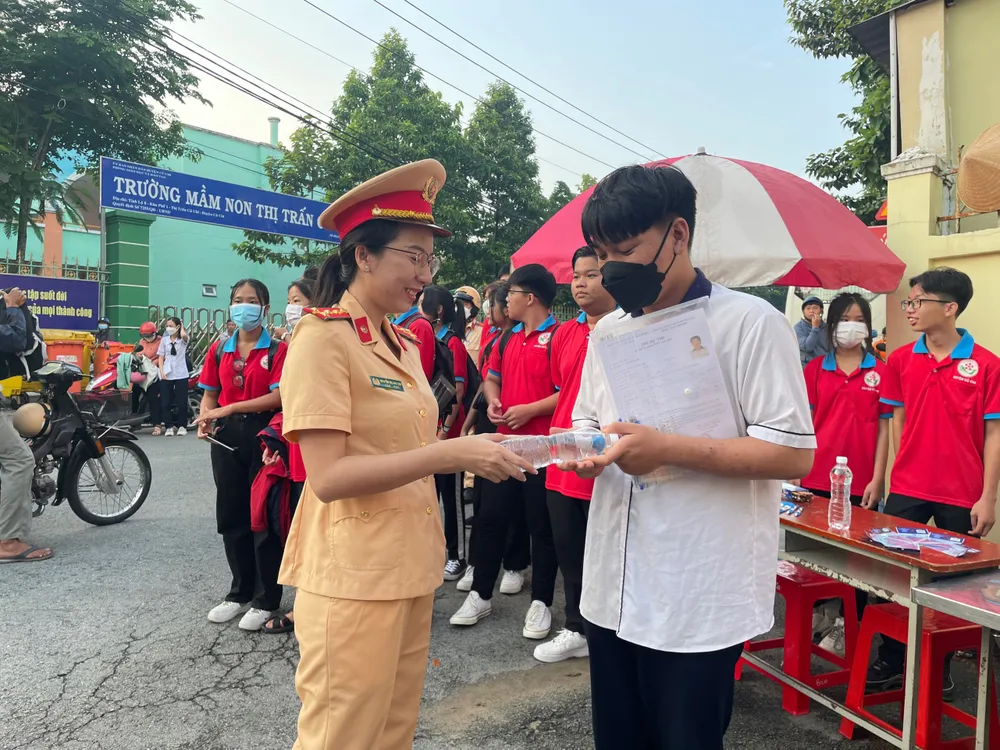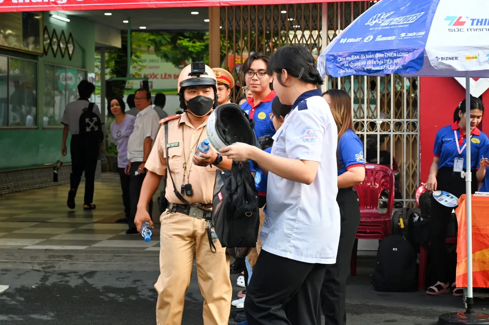 CSGT TPHCM phát tờ rơi tuyên truyền cho phụ huynh ngồi chờ các em học sinh thi