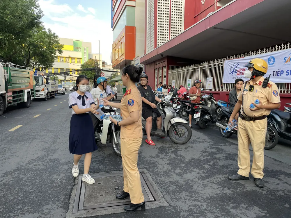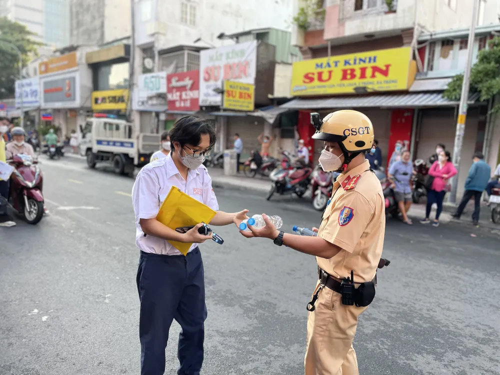 CSGT TPHCM tặng nước, bút cho các em học sinh