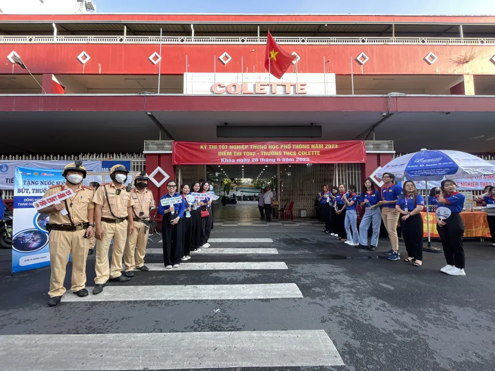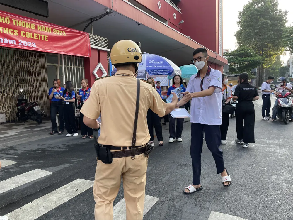 Sáng 28-6, cán bộ chiến sĩ Công an TPHCM đã túc trực tại các tuyến đường, giao lộ, trước các điểm tổ chức kỳ thi tốt nghiệp THPT năm 2023 trên địa bàn thành phố để điều tiết giao thông, đảm bảo an ninh trật tự, hỗ trợ các em học sinh và phụ huynh.