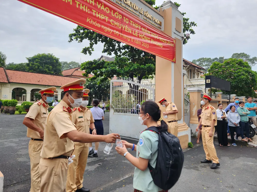 Lực lượng chức năng còn bố trí cán bộ chiến sĩ tặng nước suối, khăn lạnh cho các em thí sinh. Món quà tuy nhỏ nhưng gửi gắm trong đó là sự động viên, khích lệ giúp các em thí sinh vững tin, hoàn thành tốt được bài thi của mình.