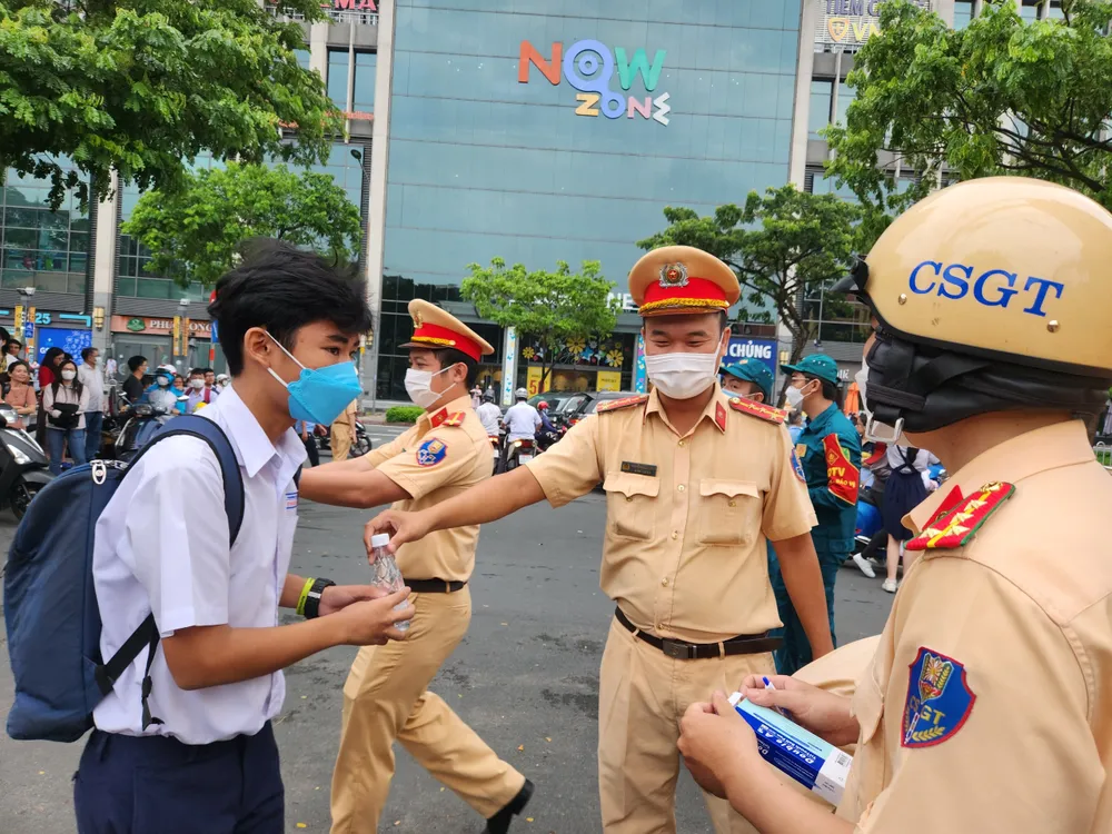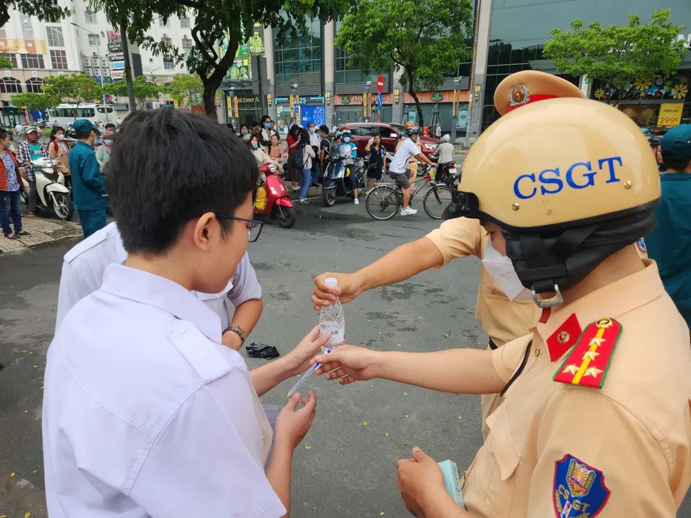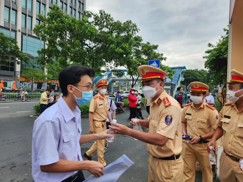 | Cán bộ chiến sĩ CSGT TPHCM phát nước cho các thí sinh |