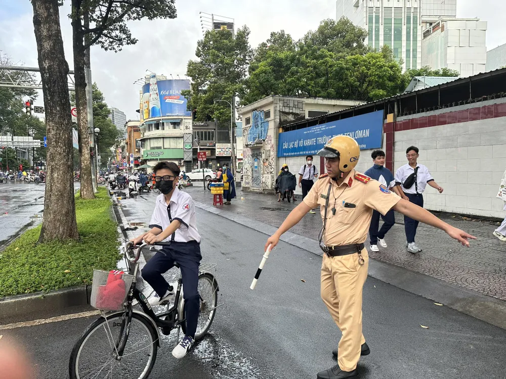 Tương tự tại các cổng trường, tuyến đường trên địa bàn các quận, huyện, TP Thủ Đức, lực lượng CSGT TPHCM có mặt từ sớm để điều tiết giao thông tránh ùn ứ, đảm bảo cho học sinh và phụ huynh có ngày khai trường an toàn.