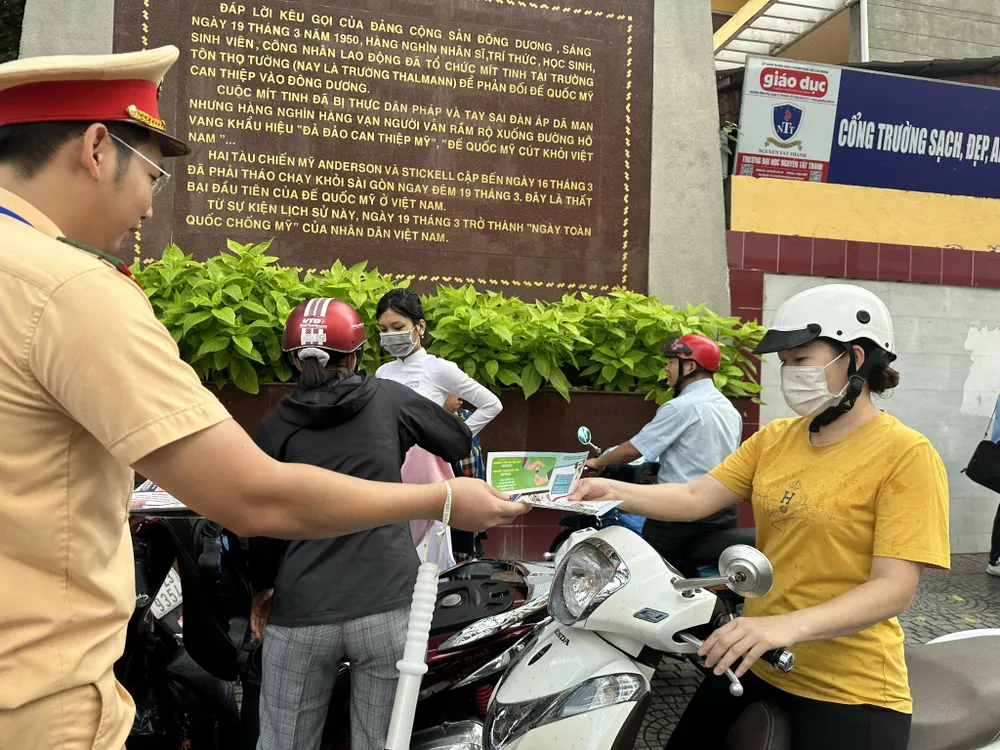 CSGT TPHCM phát tờ rơi cho phụ huynh tuyên truyền Luật giao thông |