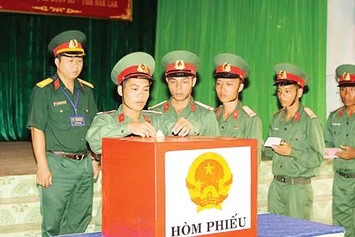 Ngày 21-5, các chiến sĩ thuộc Trung đoàn Bộ binh 95 (xã Cư Bao, thị xã Buôn Hồ, tỉnh Đắk Lắk) đi bầu sớm để làm nhiệm vụ bảo vệ các điểm bỏ phiếu trên địa bàn (Ảnh: CÔNG HOAN)