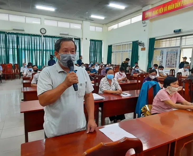 Cử tri Vũ Trường Sơn, phường 9 (quận Gò Vấp) phát biểu trong cuộc tiếp xúc với tổ ứng cử ĐBQH khóa XV, đơn vị số 7, quận Gò Vấp