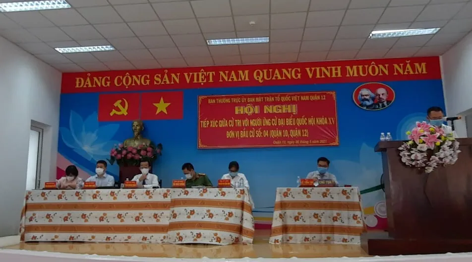 Ngày 6-5, UBND, Ủy ban MTTQ Việt Nam quận 12 (TPHCM) tổ chức hội nghị tiếp xúc cử tri với người ứng cử đại biểu Quốc hội (ĐBQH) khóa XV, nhiệm kỳ 2021-2026, đơn vị bầu cử số 4, quận 10 và quận 12.