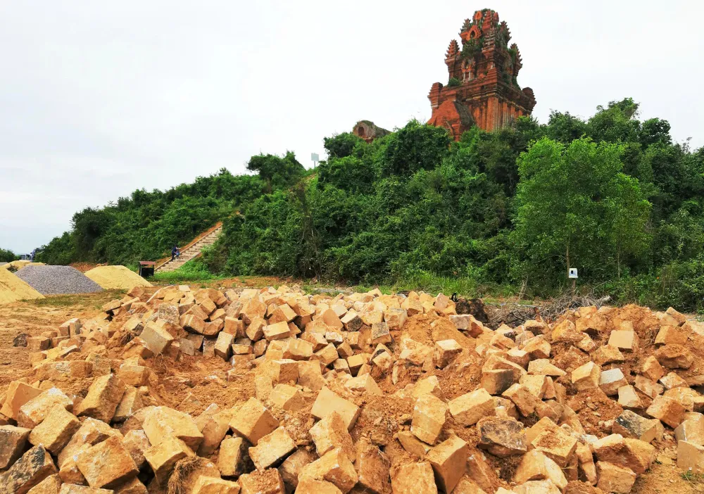 Cụ thể, đơn vị thi công huy động máy móc đến cụm tháp để san bạt, đào bới thi công các hạng mục gần chân tháp. Ngoài ra, đơn vị thi công san bạt nhiều mảng cây xanh quanh khu vực tháp, lối lên tháp... để làm mặt bằng phục vụ các công trình, hạng mục... trông rất phản cảm, nguy cơ xâm hại, làm biến dạng di tích này.