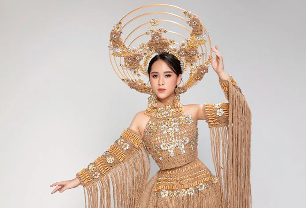Điểm đặc biệt của trang phục với chất liệu xuyên suốt là sợi đay tự nhiên được se sợi và móc cũng như đính kết hoàn toàn bằng tay, được NTK Việt Hùng lên ý tưởng cùng những nghệ nhân, sinh viên thiết kế thời trang miệt mài làm trong suốt một tuần, chỉ trước vài ngày Vũ Huyền Diệu đi thi quốc tế.