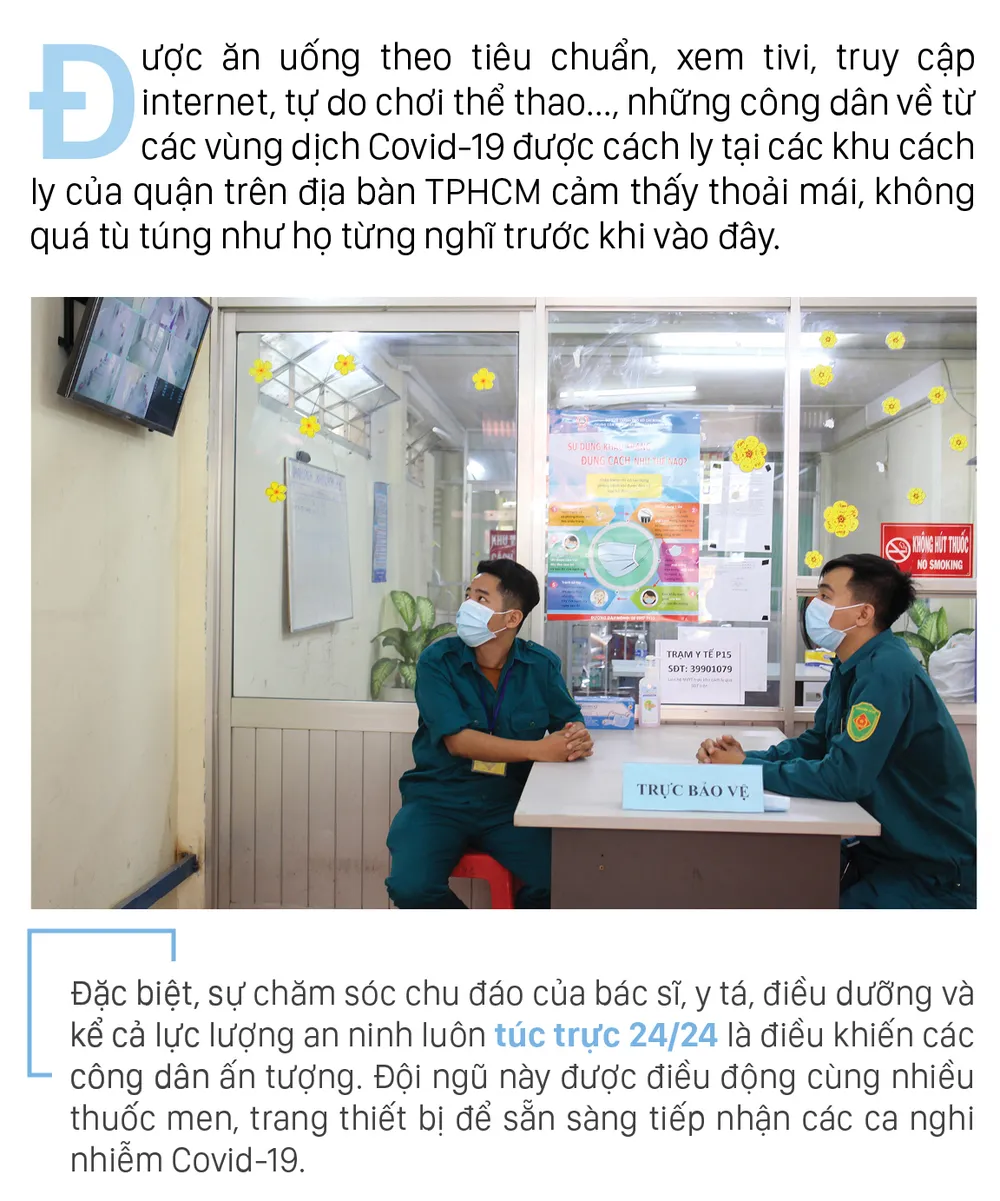 Được ăn uống theo tiêu chuẩn, xem tivi, truy cập internet, tự do chơi thể thao..., những công dân về từ các vùng dịch Covid-19 được cách ly tại các khu cách ly của quận trên địa bàn TPHCM cảm thấy thoải mái, không quá tù túng như họ từng nghĩ trước khi vào đây.