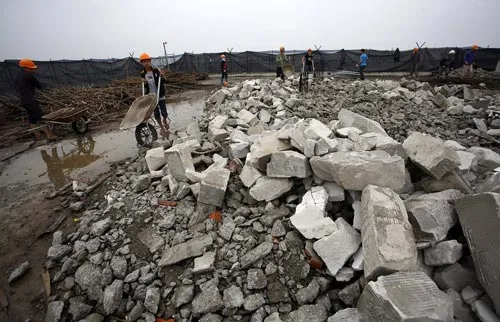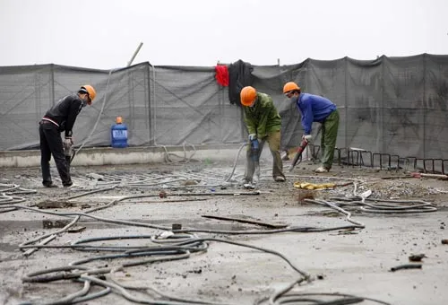 Công nhân đang tháo gỡ phần tum của tòa nhà