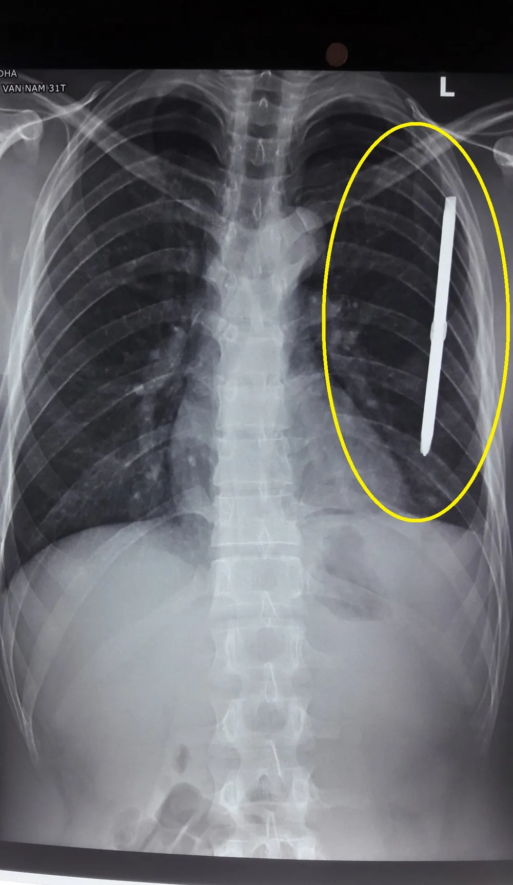 Tại đây, qua tiến hành chỉ định chụp X Quang, các bác sĩ phát hiện có một dị vật dài gần 20cm đâm xuyên vào thành ngực trái bệnh nhân N.V.N.