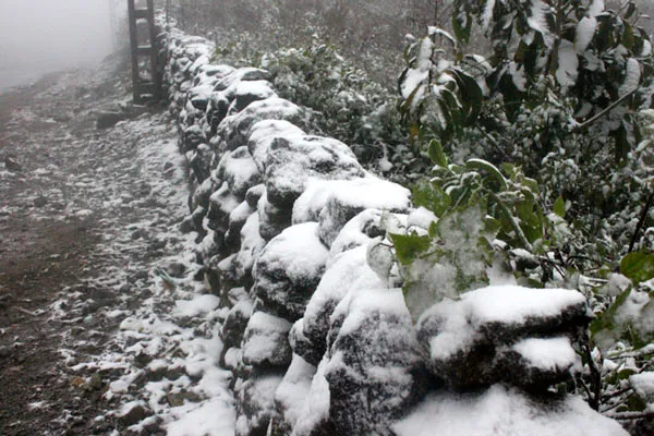 Tuyết phủ trắng dọc tường rào đá của người dân