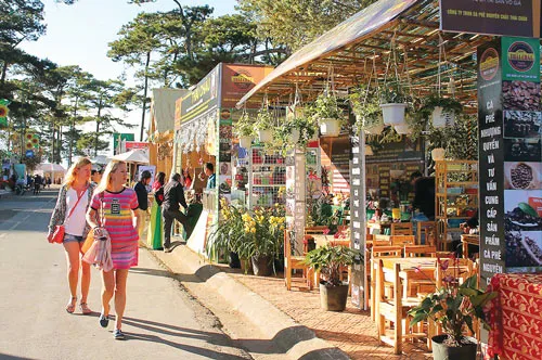 Du khách nước ngoài tham quan khu phố hàng đặc sản Đà Lạt