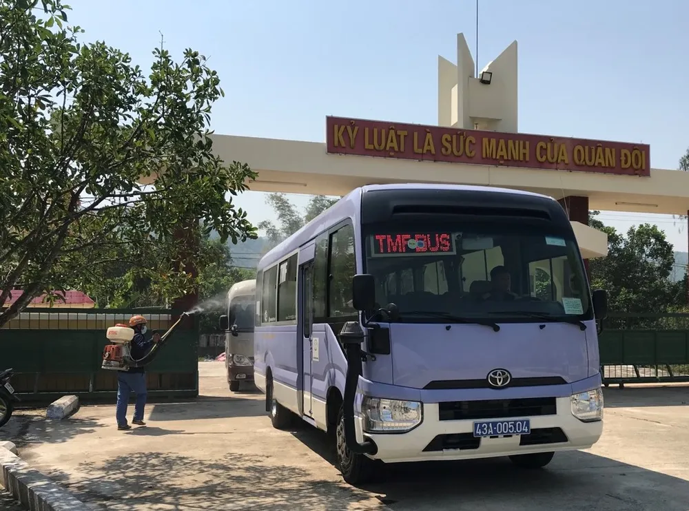 Xe buýt đưa các công dân về quê hoặc ra sân bay luôn được khử trùng khi ra vào khu cách ly