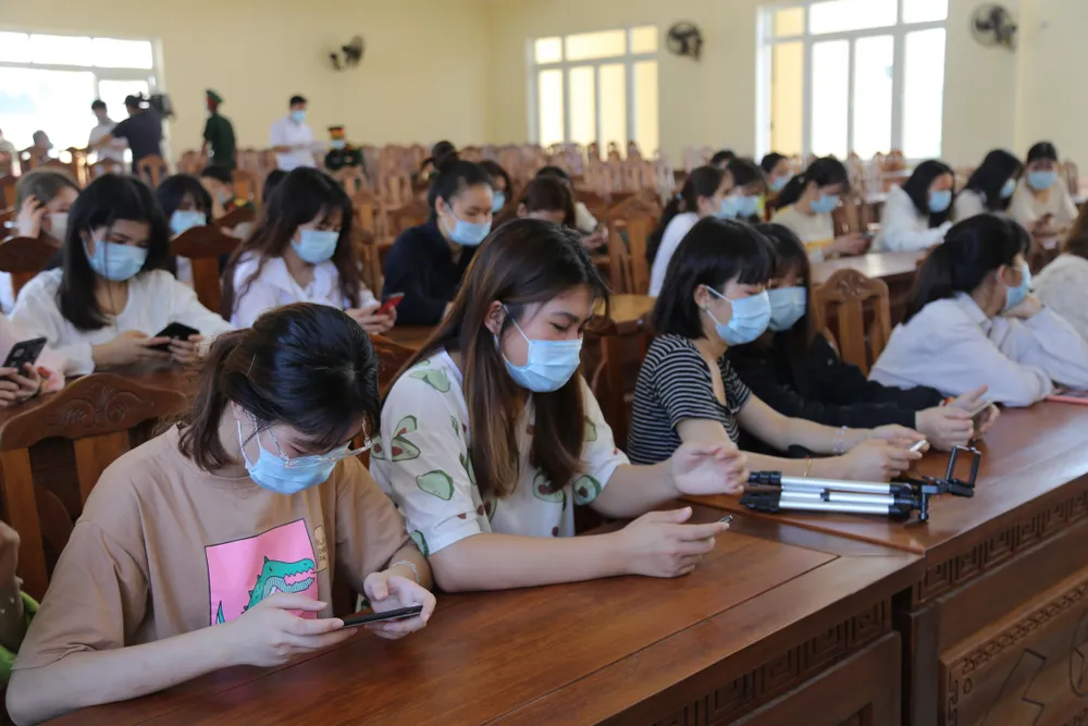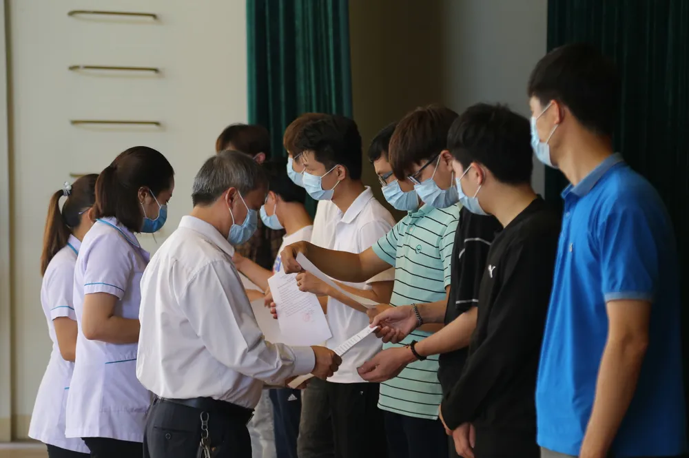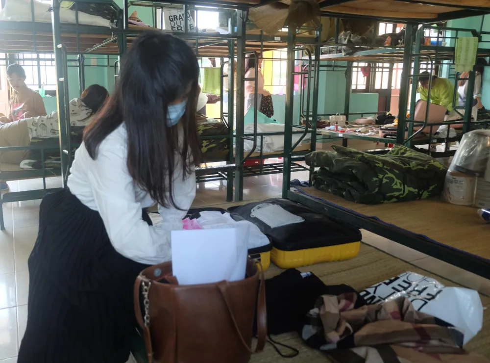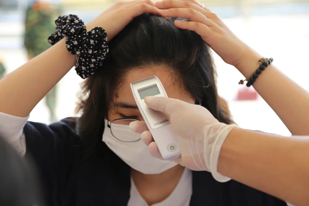 Các công dân lần lượt được kiểm tra sức khỏe, đo thân nhiệt lần cuối trước khi được rời khỏi địa điểm cách ly sau 14 ngày sống tách biệt