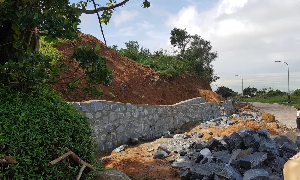 Từ đó, Sở Xây dựng TP Đà Nẵng phối hợp với chủ đầu tư và các đơn vị liên quan thống nhất phương án xây dựng kè chống sạt lở. Theo đó, đầu tư xây dựng 10 đoạn kè trọng lực xây đá hộc theo hồ sơ thiết kế đã được Sở Xây dựng thẩm định với tổng chiều dài 1.741m tại những vị trí trọng yếu; đầu tư tuyến mương phía Đông dự án với chiều dài 475m để thu gom nước từ lưu vực ngoài dự án - phía núi đổ vào dự án; đồng thời dẫn dòng và khơi thông 2 con suối tự nhiên, đào một số mương tạm để dẫn dòng. Thời gian dự kiến hoàn thành là ngày 31-8-2017. Tuy nhiên, chủ đầu tư triển khai thực hiện không đảm bảo tiến độ theo như chỉ đạo do nhiều nguyên nhân khác nhau. Vì vậy, Sở Xây dựng nhiều lần đôn đốc và đã báo cáo UBND TP Đà Nẵng và UBND thành phố cho phép gia hạn đến 30-11. Tuy nhiên, do mưa gió liên tục nên đến nay việc kè vẫn chưa hoàn thành.