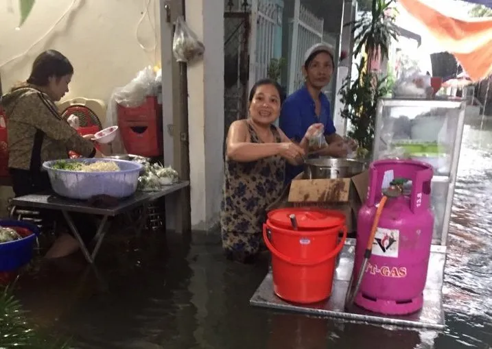Một hộ dân trên đường Thái Thị Bôi (quận Thanh Khê) vẫn buôn bán khi nhà bị ngập sâu
