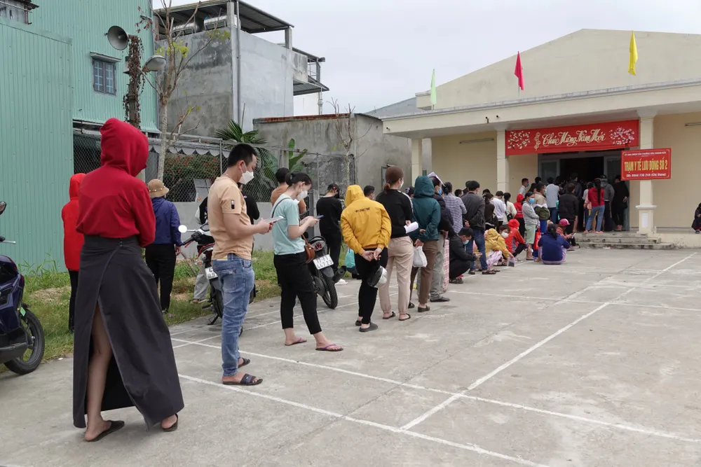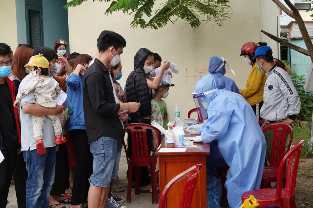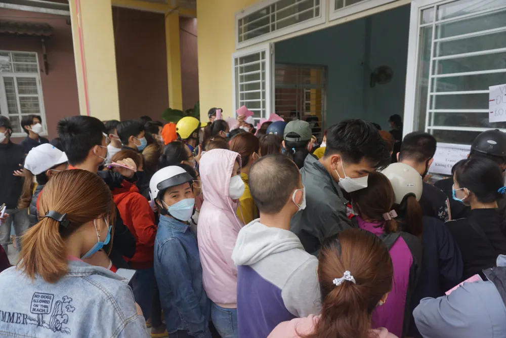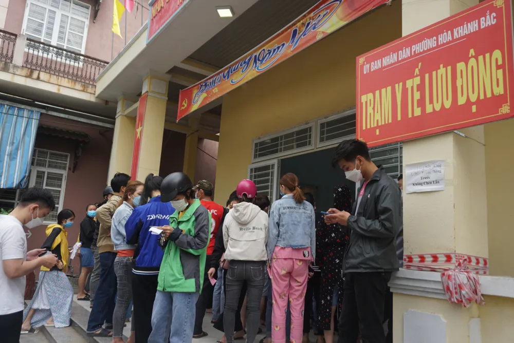 Tại Trạm Y tế lưu động số 1,2 của phường Hòa Khánh Bắc (quận Liên Chiểu), ngay trước cửa chính, gần cả trăm người chen chúc bít kín lối vào. Phía ngoài sân, người dân “rồng rắn” xếp hàng chờ đến lượt.