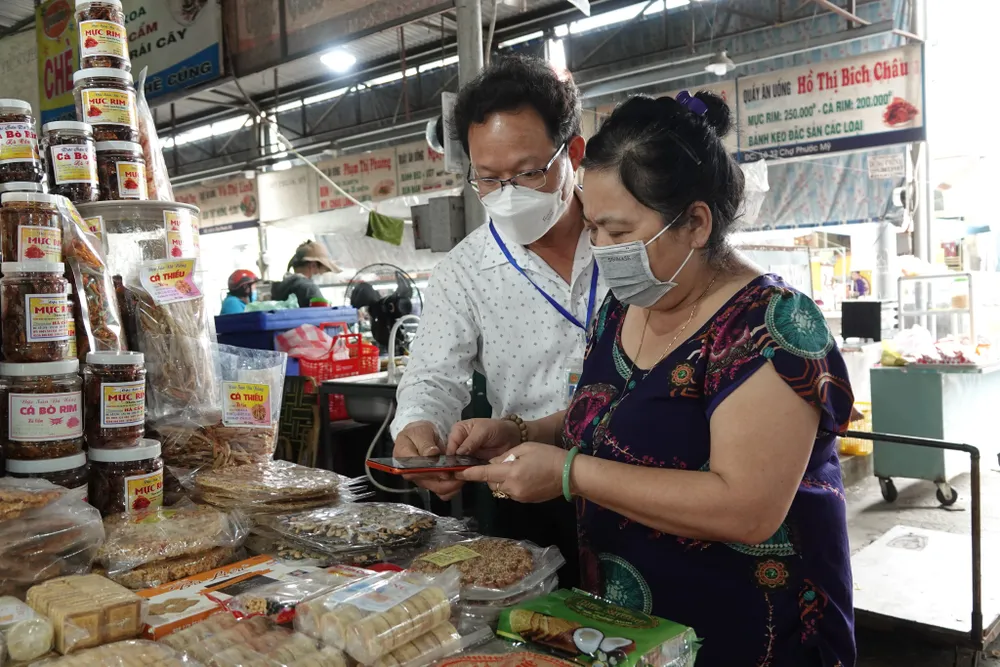 Đối với nhóm thực phẩm đã qua sơ chế và đóng gói, đội y tế phối hợp cùng Ban Quản lý các chợ kiểm tra hạn sử dụng, điều kiện bảo quản, truy xuất nguồn gốc xuất xứ hàng hóa bằng mã QR.