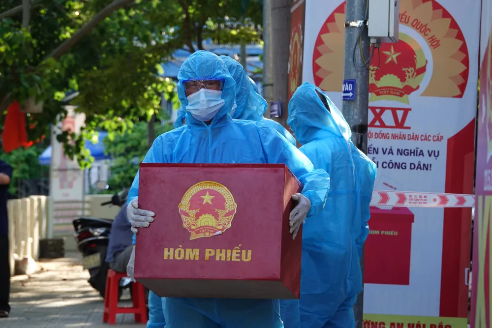 Cử tri tiếp tục được hướng dẫn rửa tay sát khuẩn rồi tiến về bàn nhận phiếu bầu cử đại biểu Quốc hội (ĐBQH) và HĐND các cấp; đến bàn viết phiếu bầu, xong bỏ phiếu vào thùng, lại bàn đóng dấu xác nhận đã đi bầu cử vào thẻ cử tri và sát khuẩn trước khi ra khỏi khu vực bỏ phiếu theo lối riêng.