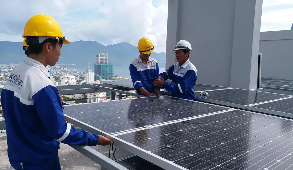 Công nhân lắp đặt hệ thống điện mặt trời áp mái nhà ở Đà Nẵng