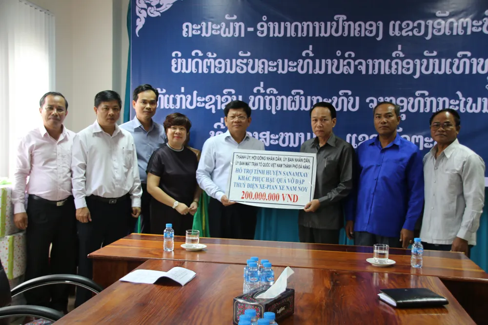 Theo đó, đoàn công tác đến thăm hỏi, động viên và trao cho chính quyền tỉnh Attapeu 2 tỷ đồng; trao cho huyện Sanamxay 200 triệu; phần còn lại tặng quà trực tiếp cho các gia đình gặp tổn thất nặng và một đơn vị quân đội của Quân khu 5 thuộc Quân đội Nhân dân Việt Nam đang tham gia cứu trợ tại Attapeu.