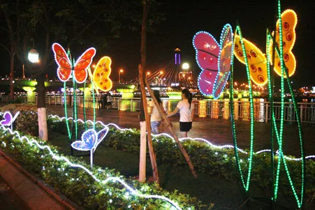 * Trong những ngày này trên các đường phố chính của TP Đà Nẵng như: Trần Phú, Lê Duẩn, 2/9… đặc biệt là đường “5 sao” Bạch Đằng được trang hoàng đèn và hoa với 11 mẫu mô hình nghệ thuật sắp đặt rất ấn tượng. Với ý tưởng dòng sông Hàn chạy thẳng ra biển lớn, đầu đường Bạch được đặt nhiều thuyền hoa, gánh hàng hoa, mô hình người địu hoa trên lưng…