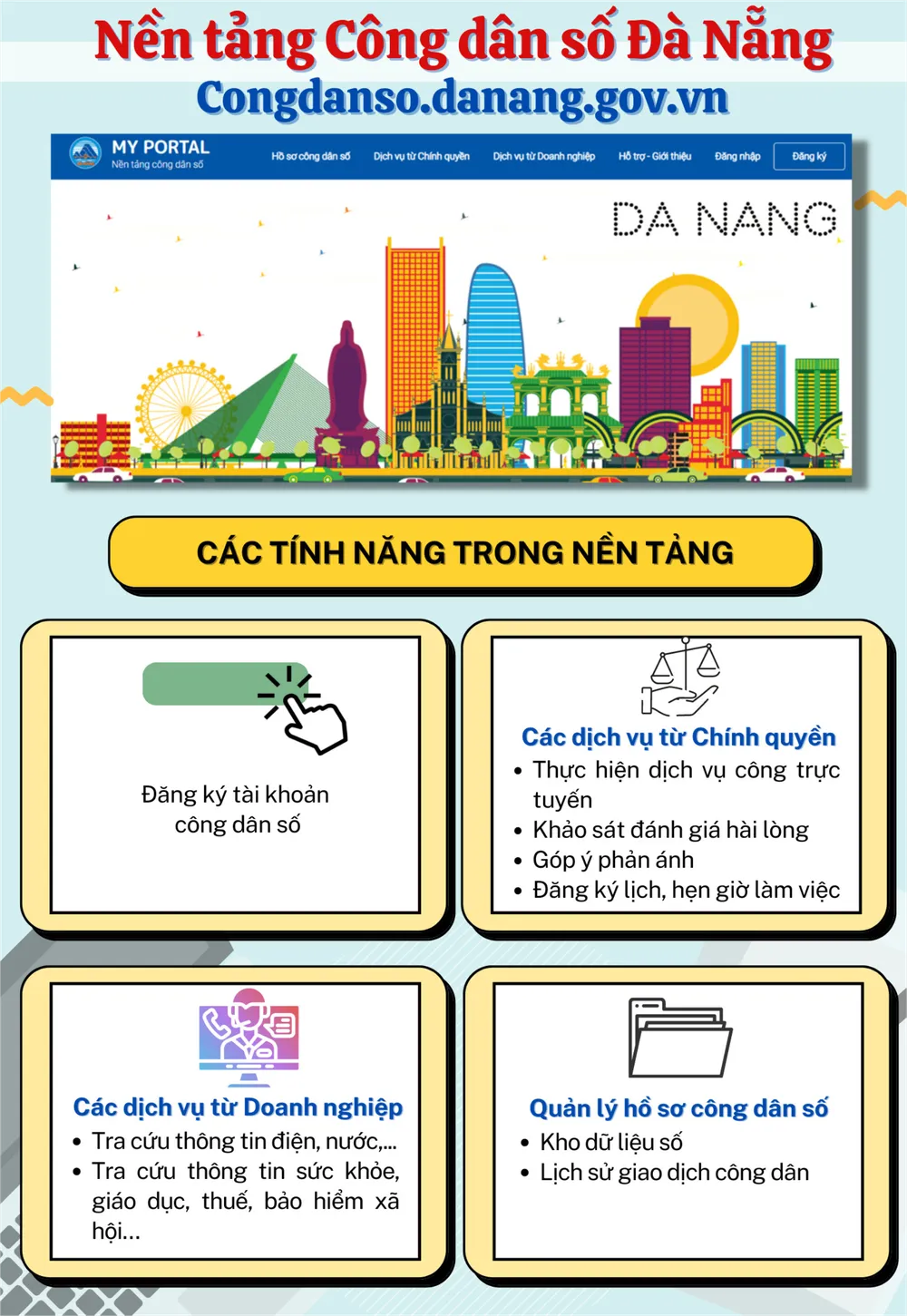 Nền tảng cũng tích hợp cung cấp đa dạng hầu hết các dịch vụ, tiện ích, thông tin của chính quyền và doanh nghiệp mà người dân là người sử dụng dịch vụ. Thông tin của người dân được bảo mật theo mô hình 4 lớp do Bộ TT-TT quy định; xác thực đăng nhập sử dụng qua OTP (tương tự như các ngân hàng đang áp dụng cho khách hàng giao dịch thanh toán).