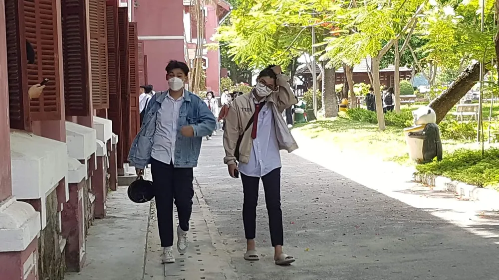 Theo ghi nhận, thời tiết Đà Nẵng nóng bức, học sinh phải mang áo khoác, che chắn để đến các điểm thi.