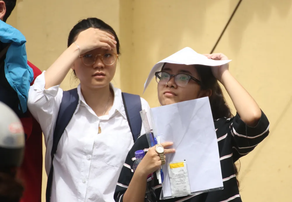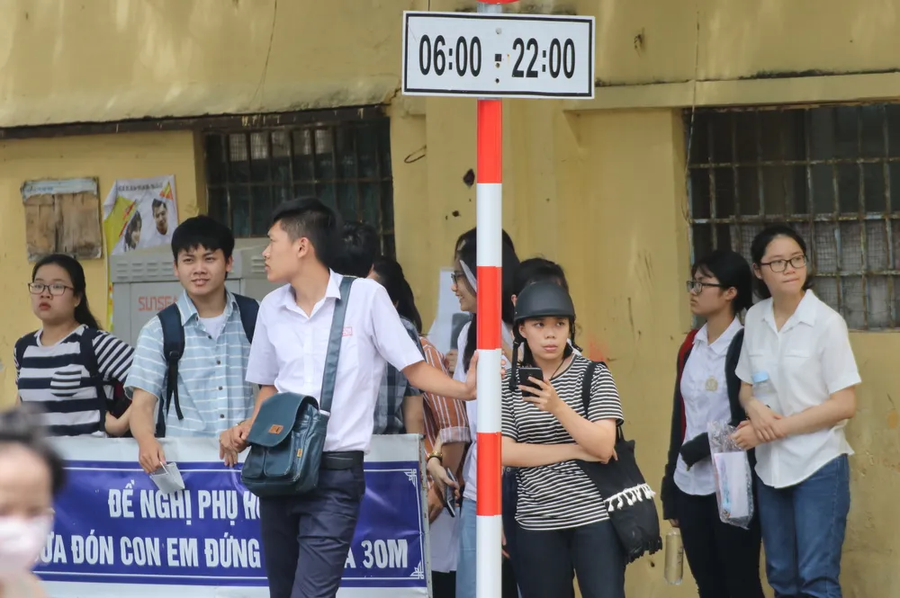 Một nhóm thí sinh đứng chờ phụ huynh đến đón sau môn thi đầu tiên