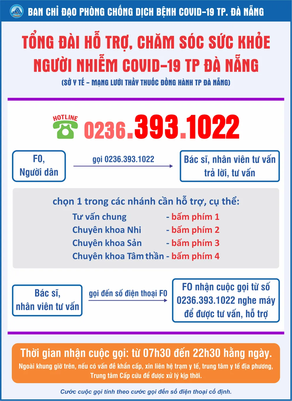 Khi người dân gọi đến đầu số (0236) 393 1022 sẽ gặp được các bác sĩ, nhân viên y tế (do Sở Y tế huy động) và được tư vấn, hỗ trợ. Các bác sĩ, nhân viên y tế sẽ trực, nhận cuộc gọi từ 7 giờ 30 phút đến 22 giờ 30 phút các ngày trong tuần.