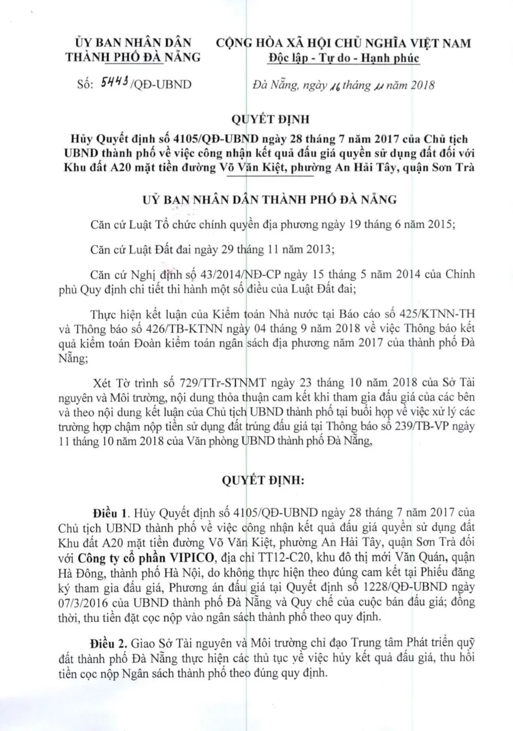 Trong đó có phương án đấu giá lô đất A20, mặt tiền đường Võ Văn Kiệt (quận Sơn Trà) và phần kết luận của Kiểm toán Nhà nước ngày 4-9-2018 đề nghị Đà Nẵng hủy kết quả trúng đấu giá của VIPICO.