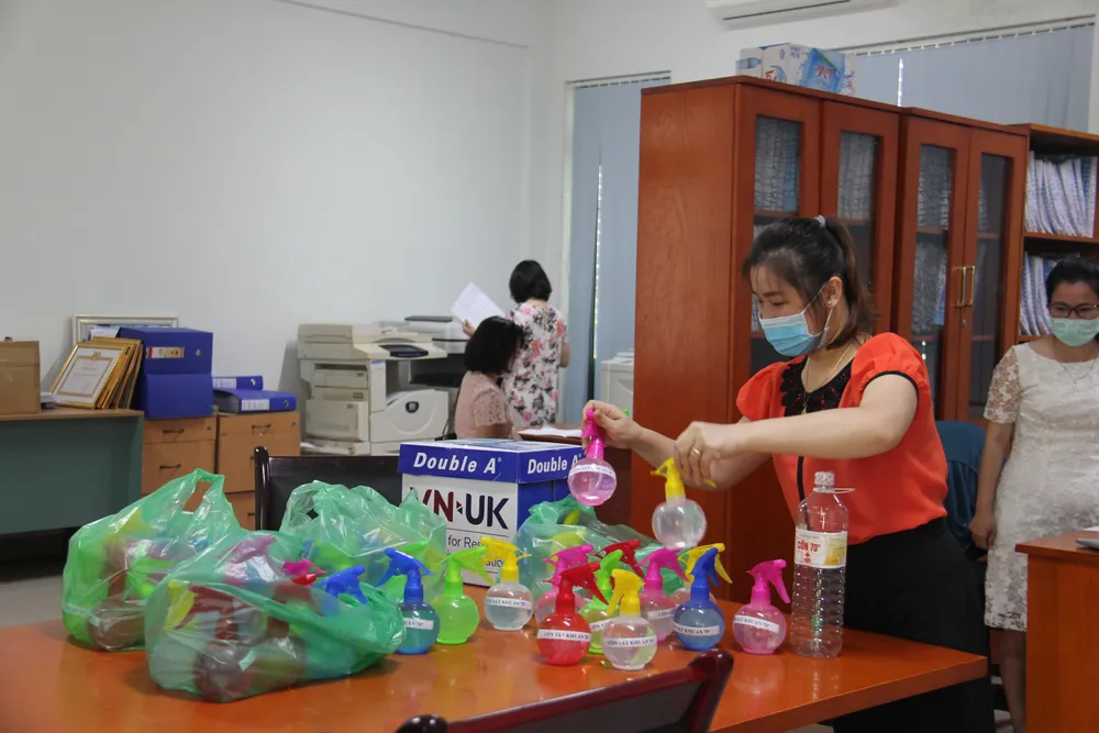 Các thầy cô chế tạo cồn sát khuẩn chuẩn bị cho công tác quay trở lại trường học sau thời gian nghỉ dài ngày vì dịch bệnh