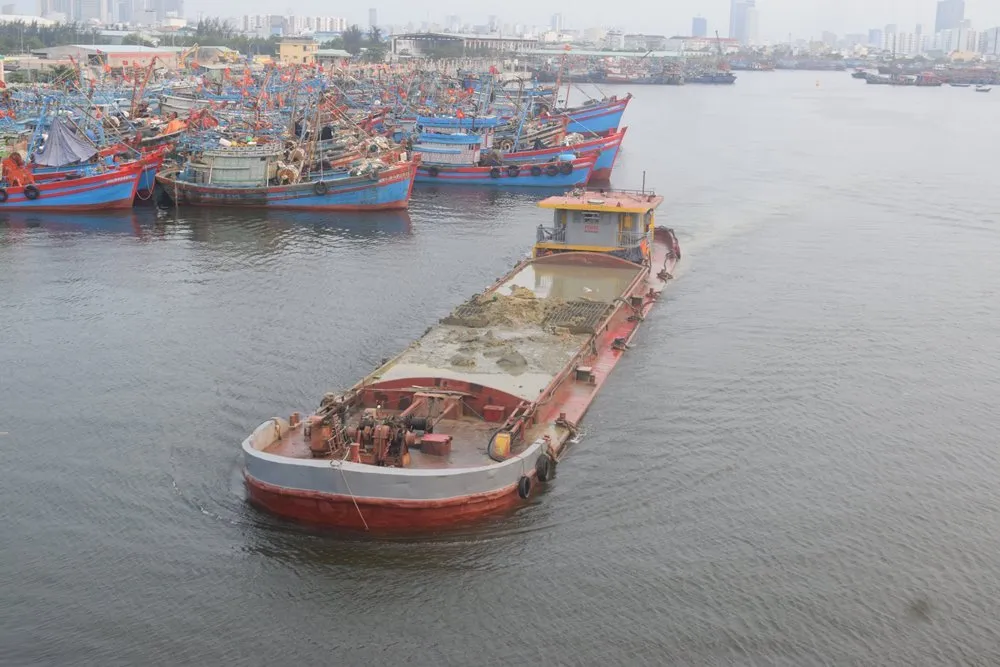 Theo ghi nhận, do còn có nhiều tàu cá ngoại tỉnh neo đậu trong khu vực thi công nên Công ty CP Tư vấn và xây dựng Phú Xuân chỉ mới triển khai 1 cụm phương tiện sà lan và tàu ngoạm để nạo vét trong điều kiện chật hẹp, thậm chí là có tàu cá nhỏ còn chạy qua sát tàu ngoạm.