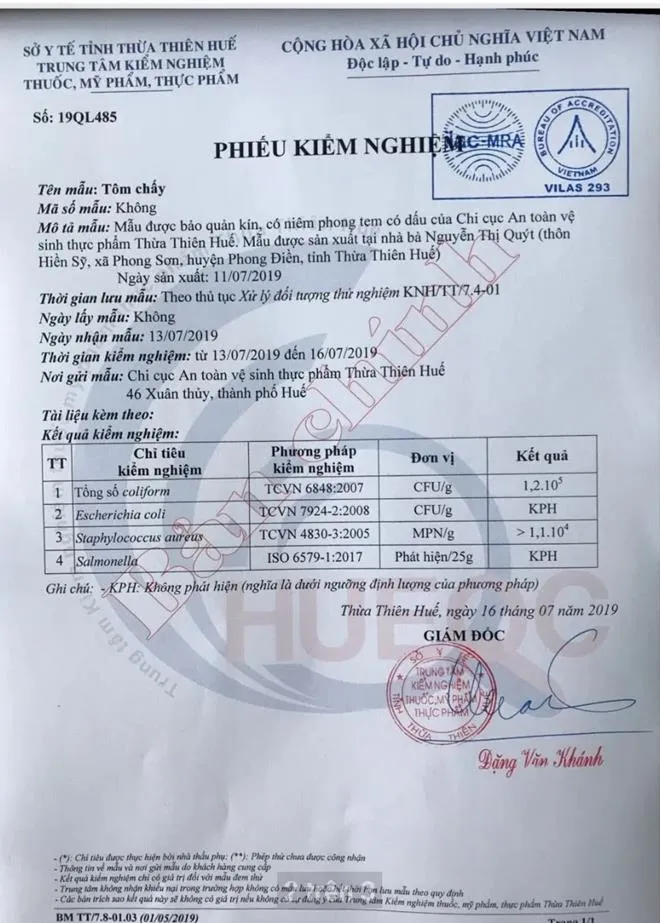 Tuy nhiên, do thức ăn sau tiệc cưới đã được gia đình ông M dọn dẹp nên chỉ lấy được mẫu hành phi và tôm được rải trên món xôi. Trung tâm kiểm nghiệm thuốc, mỹ phẩm, thực phẩm, Sở Y tế tỉnh Thừa Thiên - Huế đã tiến hành kiểm nghiệm và đến ngày 16-7 đã có kết quả.