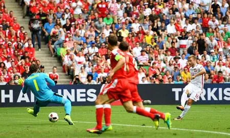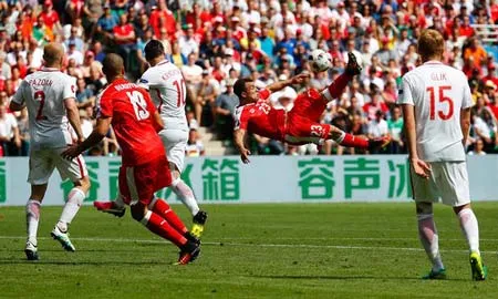 Sau nhiều pha dồn ép, đến phút 82, Xhedan Shaqiri đã khiến cả sân Saint-Etienne bùng nổ với cú dứt điểm “xe đạp chổng ngược” từ ngoài vòng 16m50, xé tung mành lưới của thủ thành Fabianski, giúp Thụy Sỹ san hòa 1-1. Đấy là pha lập công xứng đáng nằm trong tốp đầu của VCK EURO 2016.