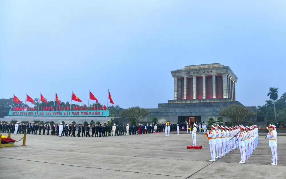 Các đồng chí lãnh đạo Đảng, Nhà nước và các đại biểu thành kính tưởng niệm Chủ tịch Hồ Chí Minh trước Lăng Người. Ảnh: VIẾT CHUNG