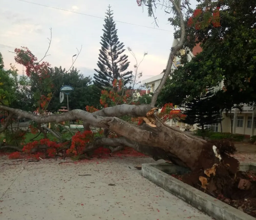 Cây phượng cổ thụ bất ngờ bật gốc đổ xuống giữa sân trường. Rất may, vào thời điểm trên, học sinh chưa đến trường nên không có ai thương vong.