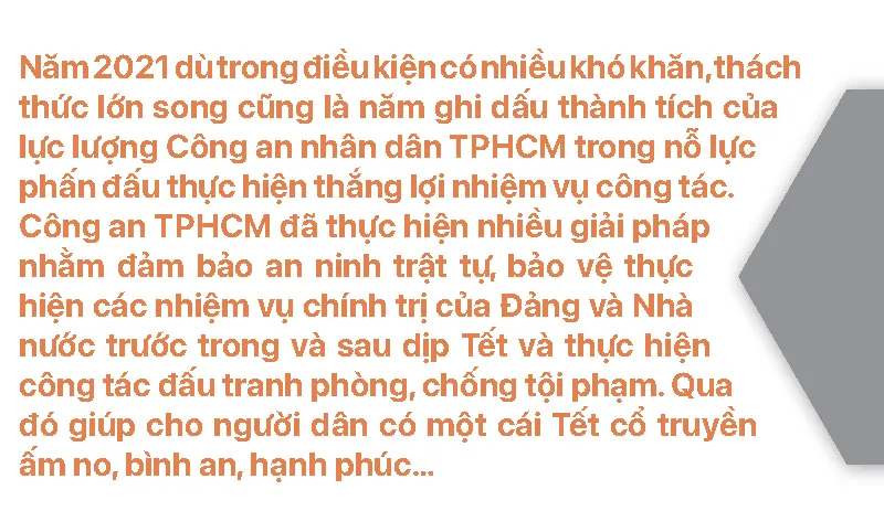 Dịp Tết Nguyên đán Nhâm Dần, cán bộ, công chức, viên chức, người lao động trên cả nước sẽ được nghỉ Tết 9 ngày (từ ngày 29-1 đến 6-2). Đây cũng là một kỳ nghỉ dài để người dân trong TP tham gia các hoạt động vui xuân, đón tết. Cũng như mọi năm trước, trong và sau Tết Nhâm Dần, lực lượng CSHS Công an TPHCM tập trung 100% quân số để đảm bảo an ninh trật tự cho người dân hưởng trọn tết sum vầy bên gia đình sau đại dịch. Đơn vị sẽ huy động tối đa lực lượng, triển khai nhiều biện pháp tấn công, trấn áp mạnh tội phạm.