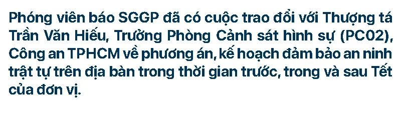 Để chuẩn bị cho công tác đảm bảo an ninh trật tự trước, trong và sau Tết thì đơn vị xây dựng phương án, triển khai kế hoạch đến các đội chủ động phối hợp với công an địa phương. Huy động cán bộ chiến sĩ túc trực 100% quân số để trực chiến. CSHS Công an TPHCM tham mưu với các đơn vị, chủ động phối hợp với Công an 21 quận huyện, TP Thủ Đức xem xét tình hình địa phương để bố trí quân số trực chiến nhằm đảm bảo yêu cầu nhiệm vụ. Một số địa bàn trọng điểm cũng phải thường xuyên đảm bảo quân số để thực hiện tốt các nhiệm vụ được giao.