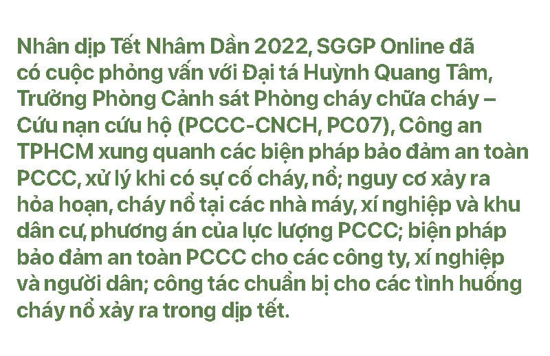 PHÓNG VIÊN: Năm 2021 là năm khó khăn với lực lượng công an TPHCM nói chung và lực lượng cảnh sát PCCC nói riêng. Thời gian thành phố thực hiện giãn cách, lực lượng PCCC đã có những biện pháp gì để bảo đảm an toàn PCCC và xử lý khi có sự cố xảy ra? Thực tế, đã có sự cố nào nghiêm trọng xảy ra không, thưa ông?