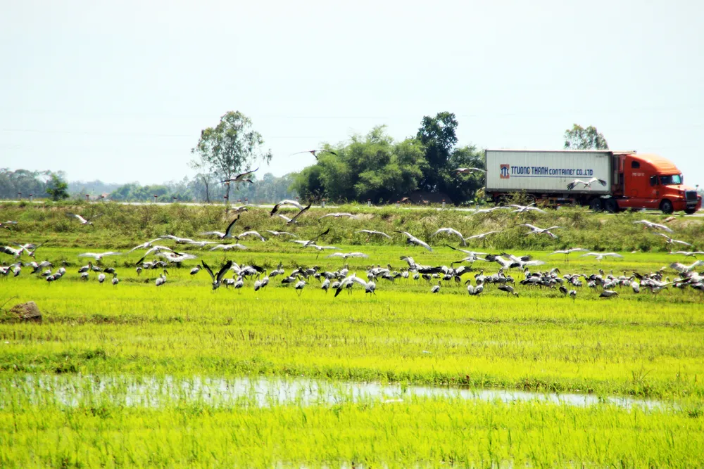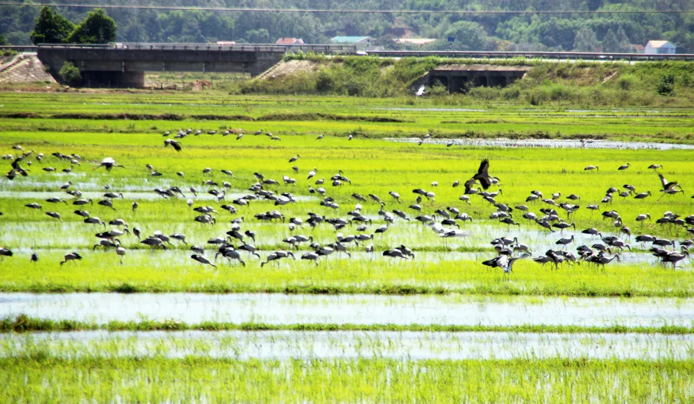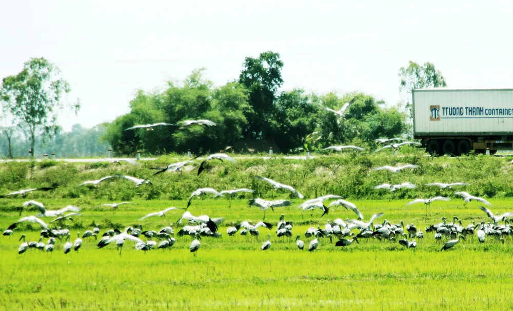 Cánh đồng xuất hiện đàn chim nằm bên quốc lộ 1A, đoạn gần tuyến tránh vào thị trấn Mộ Đức